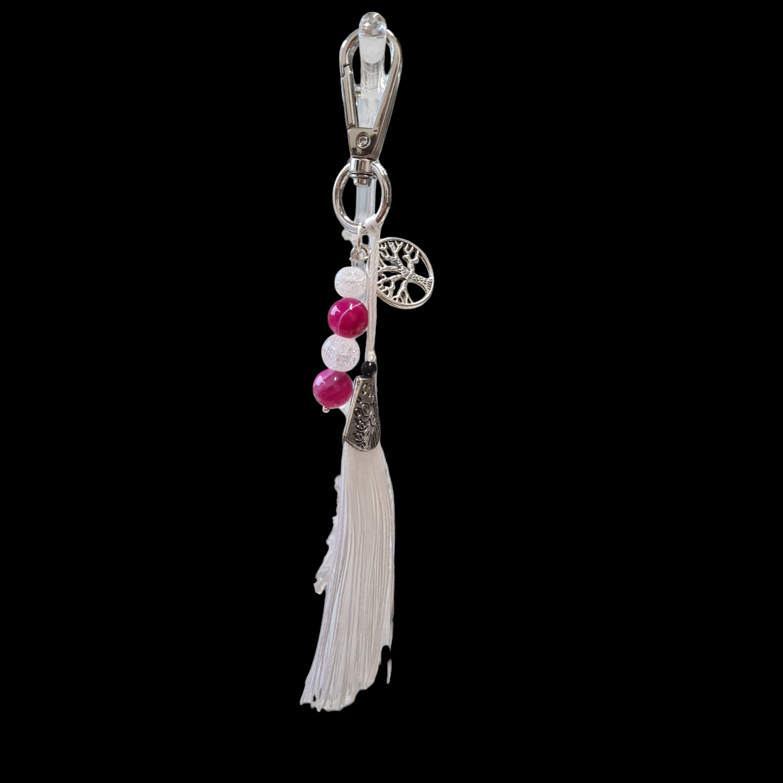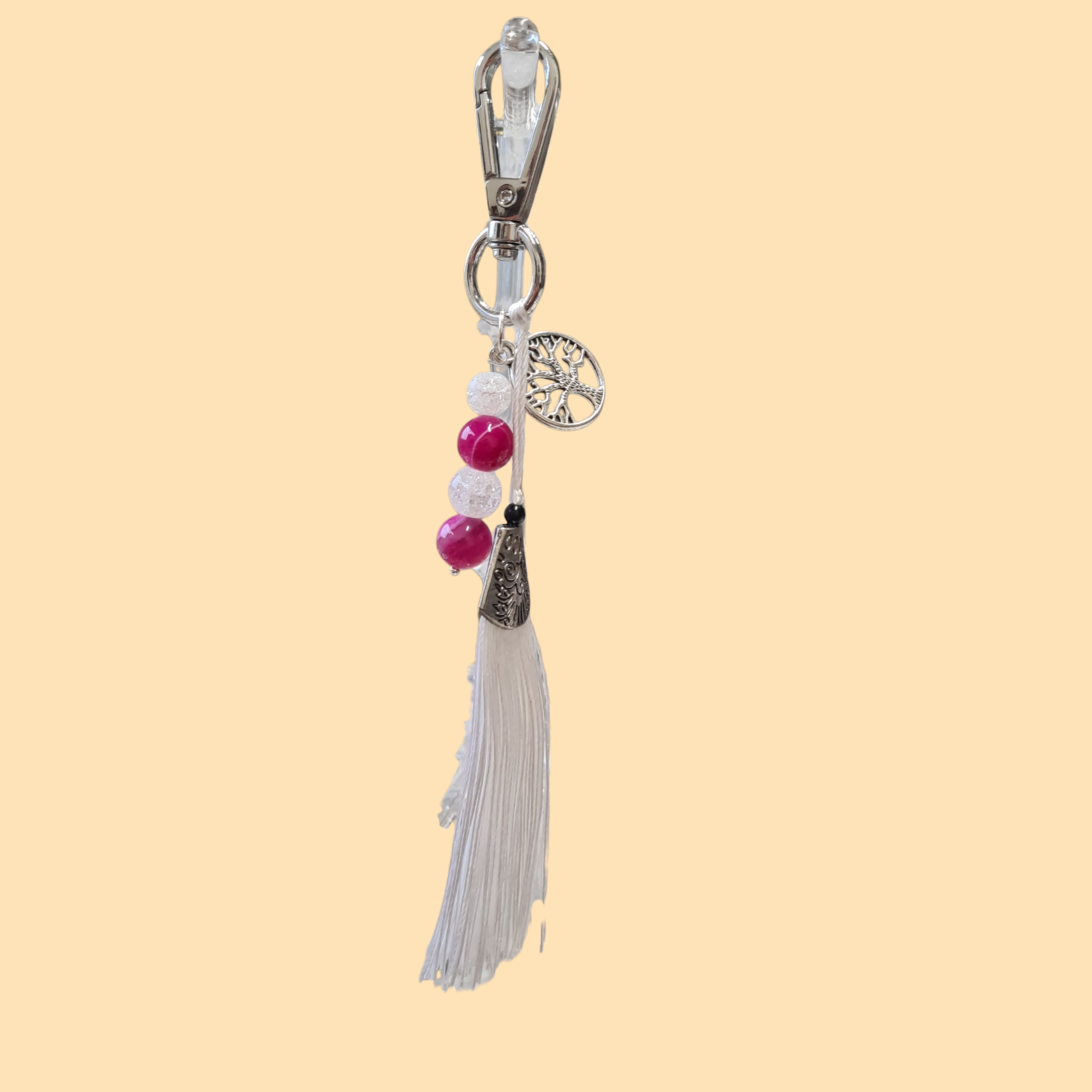 Bijou à suspendre à votre sac à main avec agate rose, arbre de vie et pompon blanc