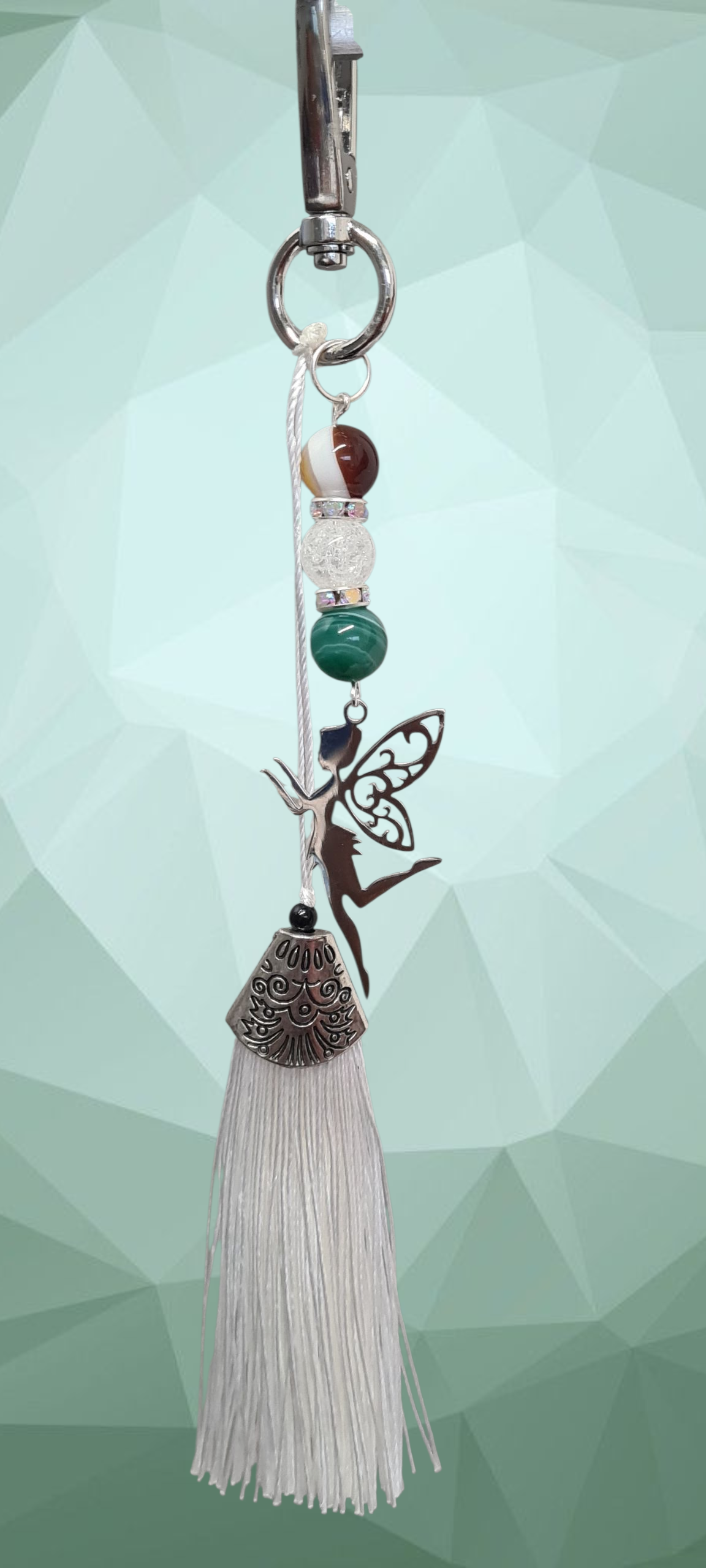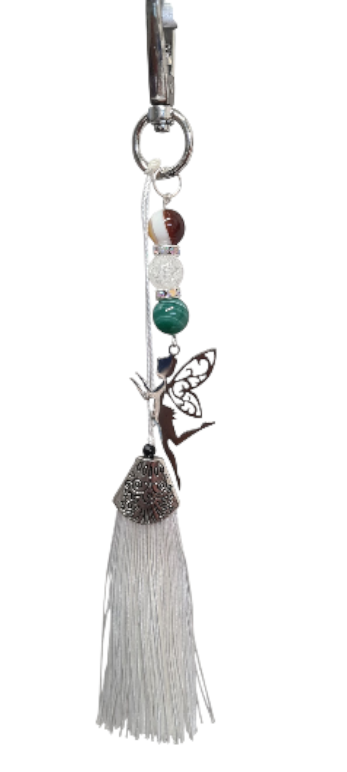 Bijou à suspendre à votre sac à main avec agate verte et marron, la fée clochette et pompon blanc